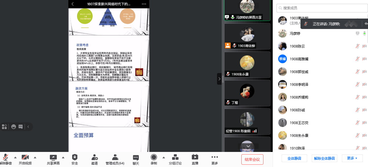 冯彦婷同学介绍了她的创业项目:新梦婷公司——一家新兴网络时代下的新零售企业;黄丽颖同学的网上花店以及张明瑞同学的百货店,无一不体现出互联网时代下网络为人们带来的种种便利;魏海超同学的助“农”创业项目,以特色农产品为主体,在各大电子平台上大放异彩,服务社会,回馈社会。