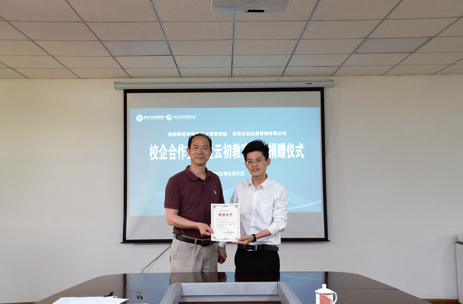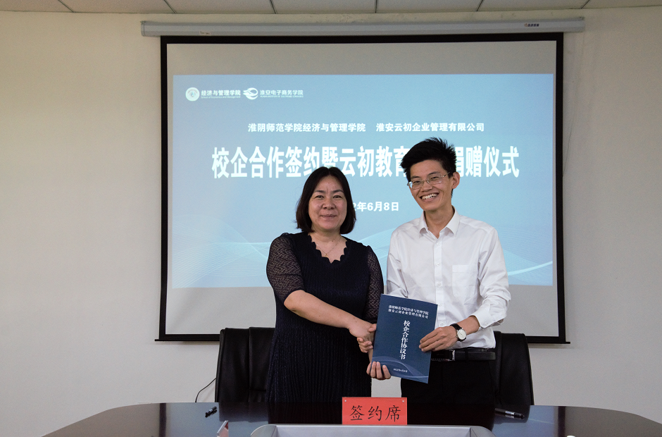6月8日下午,云顶国际8588yd经济与管理公司与淮安云初企业管理有限公司校企合作签约仪式暨“云初教育基金”捐赠仪式,在交通路校区经管楼301举行。经济与管理公司党委书记丁志同、经理张言彩,淮安云初企业管理有限公司总经理曹聪、淮安陶行知研究会会长陈波等出席活动。