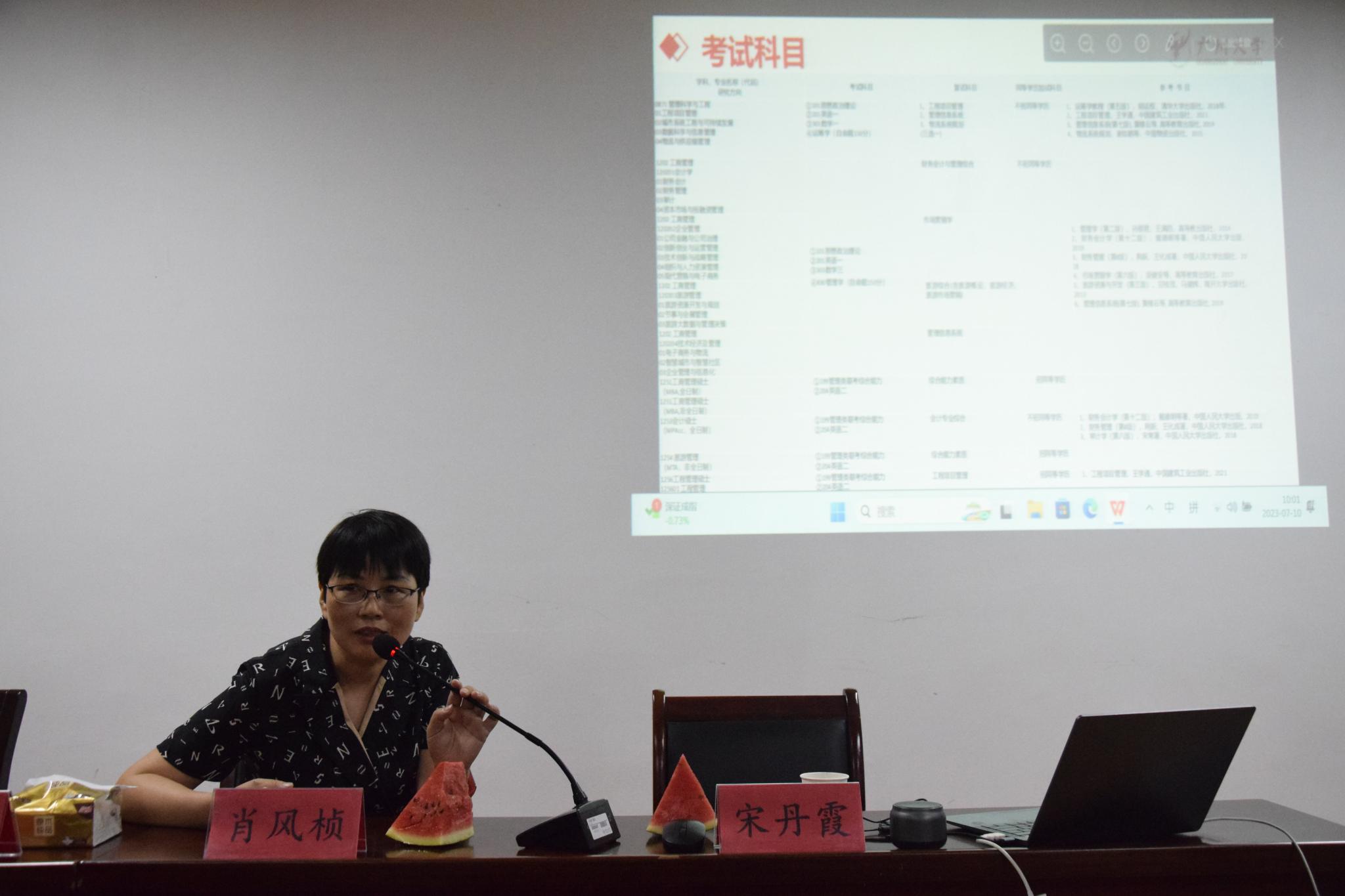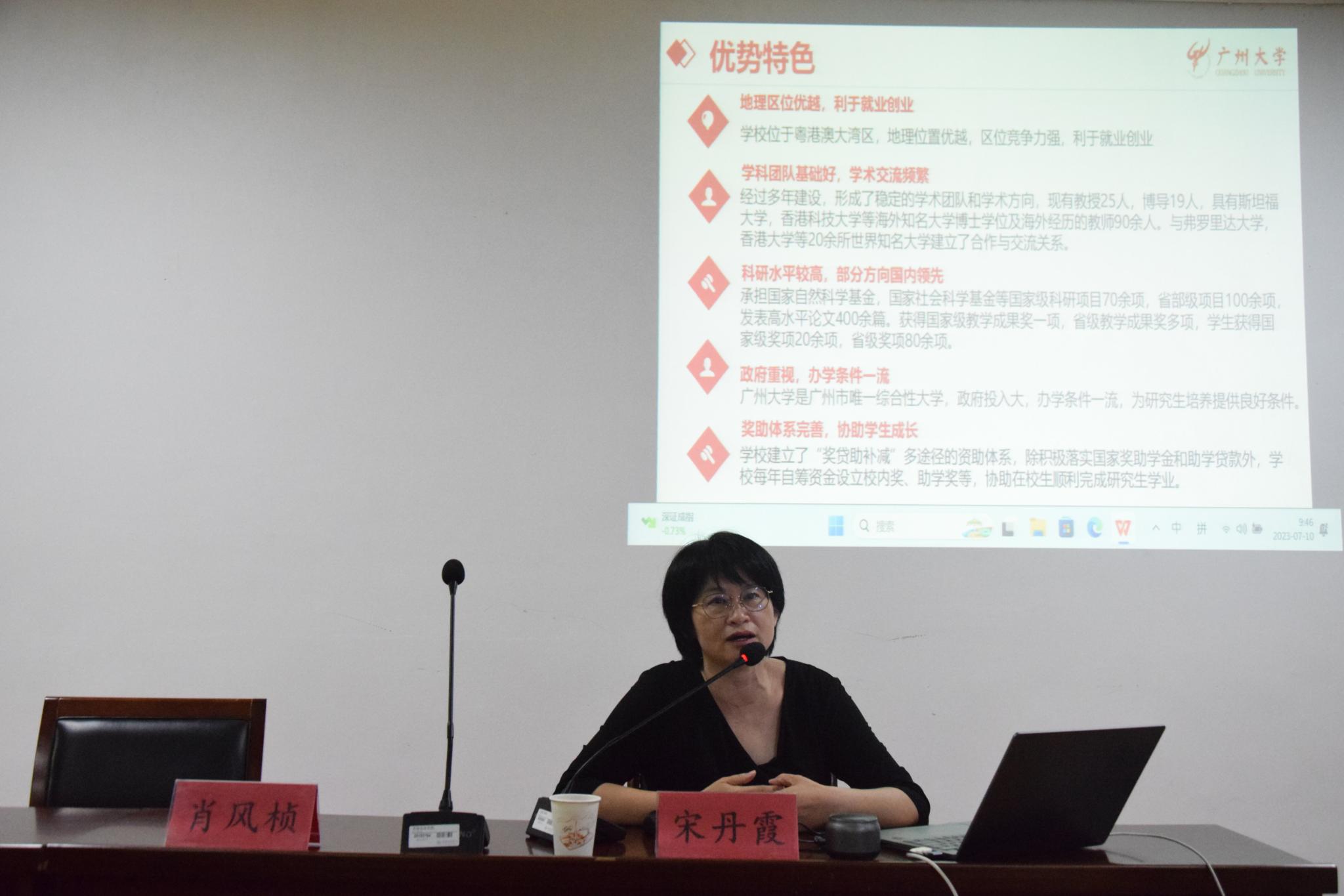 第二项议程是广州大学管理公司宋丹霞老师、肖风桢老师对公司、公司、报名人数、就业去向等内容一一介绍。其学科点分为工商管理一级学科博士点、工商管理与管理科学与工程两个硕士点及四个专硕点。宋丹霞老师着重从广州大学地理区位、公司团队、科研项目、政府投入、奖助体系五个方面的优势展开讲解,并提出该公司报名可实行提前面试。随后,各位考研学子针对自己的疑惑提出面试、教材课本存在异同等问题的答辩。