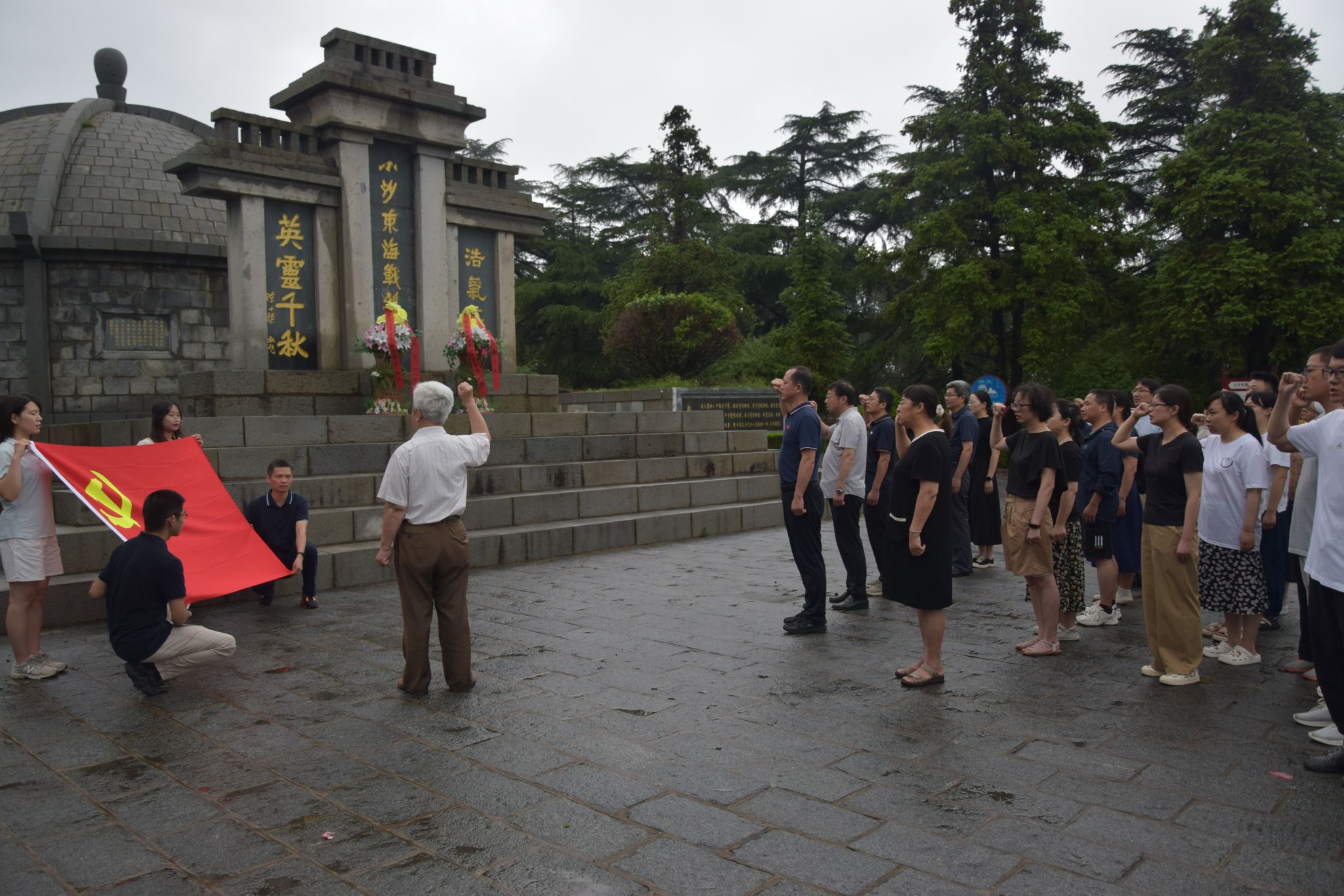 在庄严肃穆的抗日山烈士陵园,天空布满厚重的云层,细雨如织,轻轻拂过陵园的每一寸土地,仿佛在为那些逝去的革命先烈默哀。全体党员在讲解员的带领下拾级而上,踏入了这片被雨水洗涤得更加庄严的土地,瞻仰小沙东海战烈士冢并向烈士墓敬献花篮。