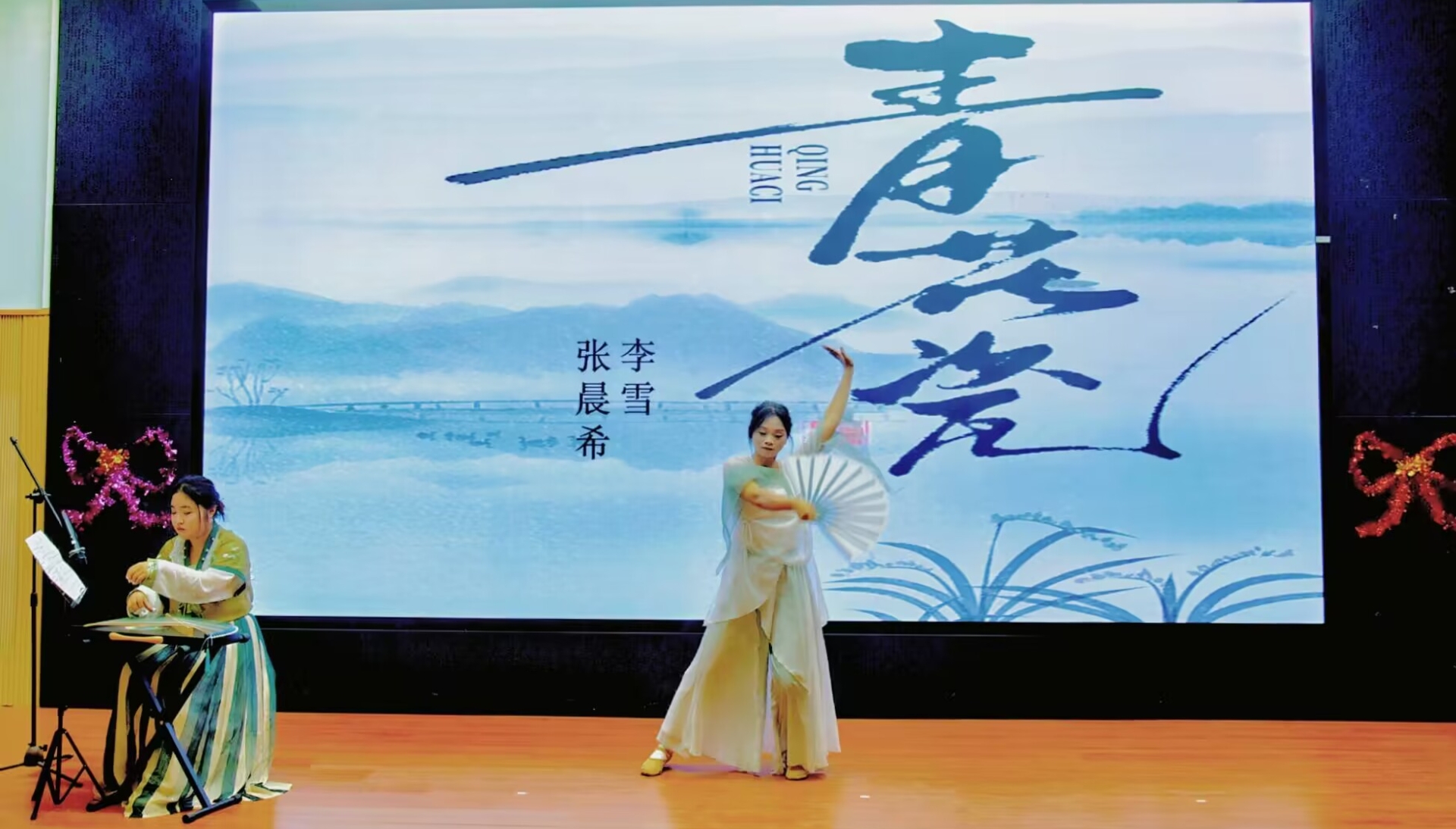 古筝声声如清泉,舞步翩翩似烟云。李雪与张晨希同学用古筝与舞蹈的融合,将《青花瓷》的雅致展现得淋漓尽致,绘就了一幅诗情画意的画卷。