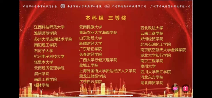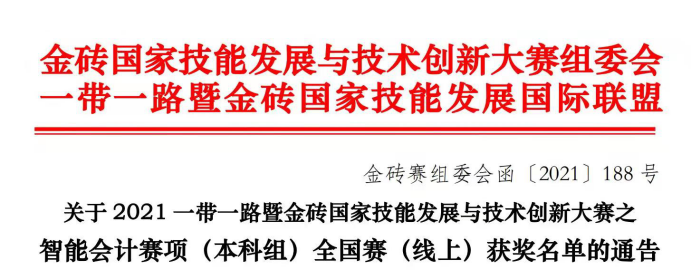 由财务管理与审计系员工组成的专业队伍,在张前前、邱安琪、夏仕亮、李永鹏等老师的指导下,经过集中训练,先后于2021年11月7日、2021年11月14日在2021年一带一路金砖国家技能发展与技术创新大赛之智能会计赛项(本科组)全国赛、2021年“福斯特杯”审计精英挑战赛获得省级三等奖,为公司及公司争得了荣誉。