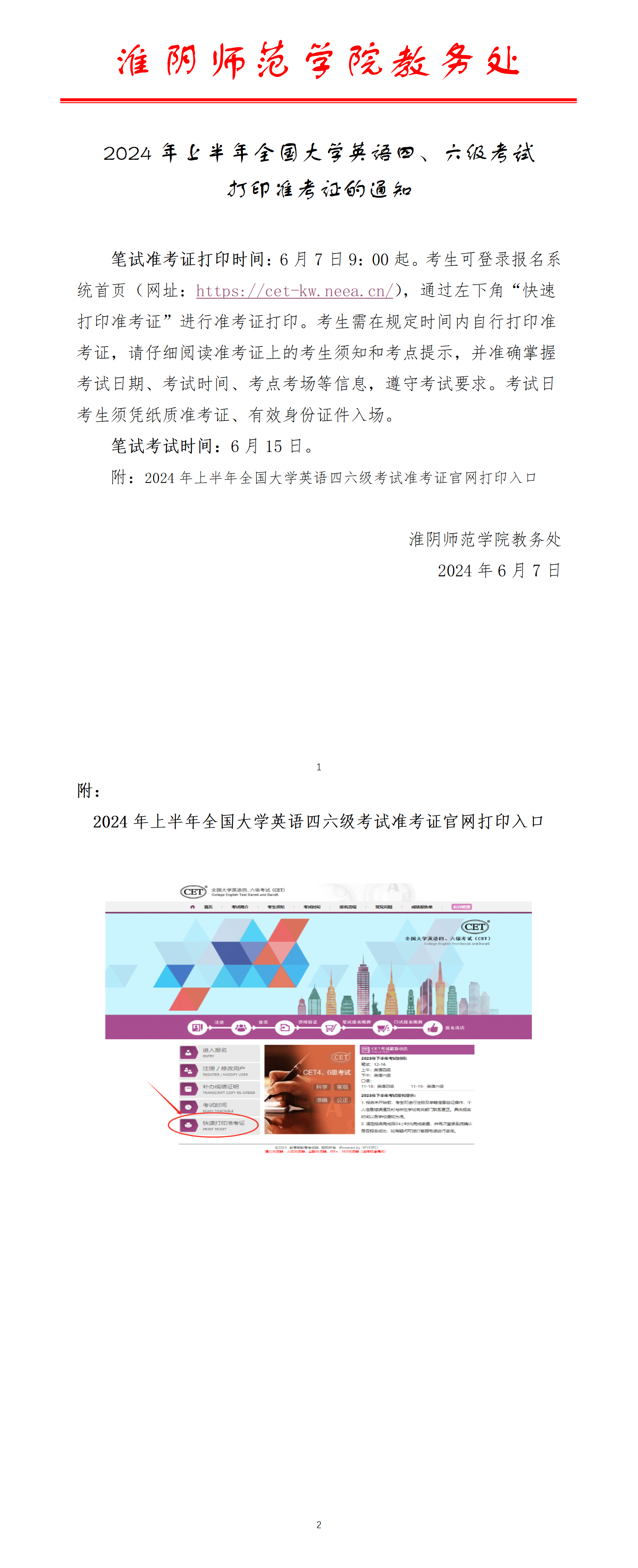 2024年上半年全国大学英语四、六级考试打印准考证的通知